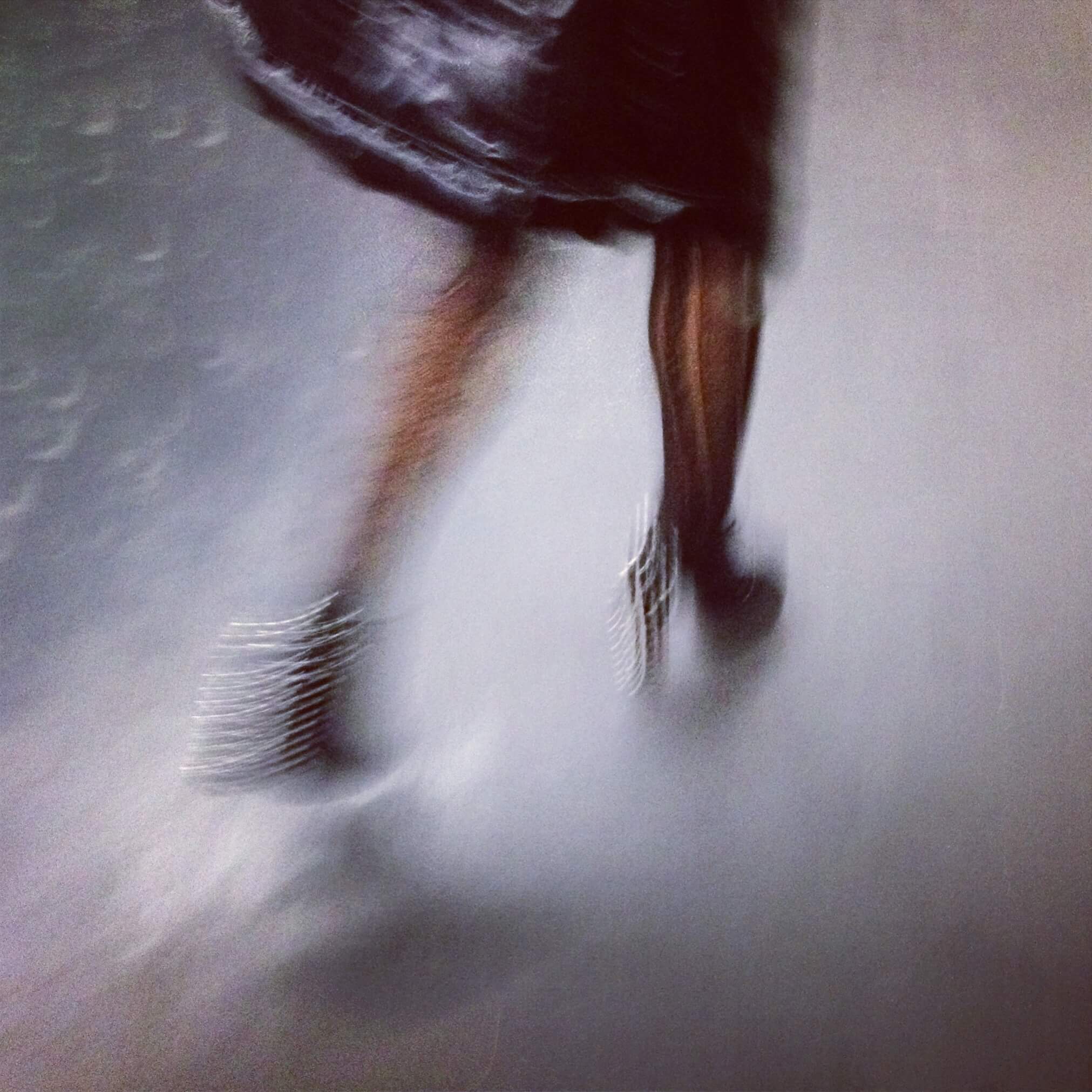 Ici le mouvement agit sur la composition. La robe noire resserre le cadre, les escarpins dessinent des lignes de fuite. L’espace d’un instant, ces jambes « compas » dessinent le trajet de ces inconnues et interrogent sur le mystère de leur destination.
